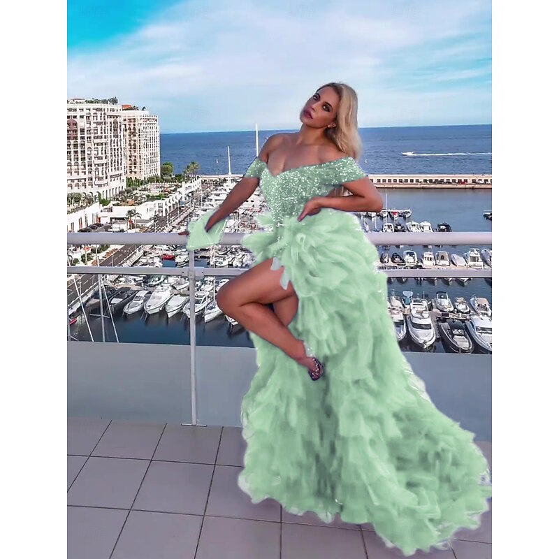 More information about Jumpsuits Evening Gown Sparkle & Shine Dress Masquerade Quinceanera Court Train Short Sleeve Off Shoulder Detachable Sequined with Overskirt Pure Color