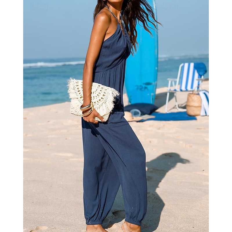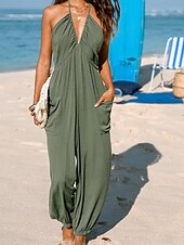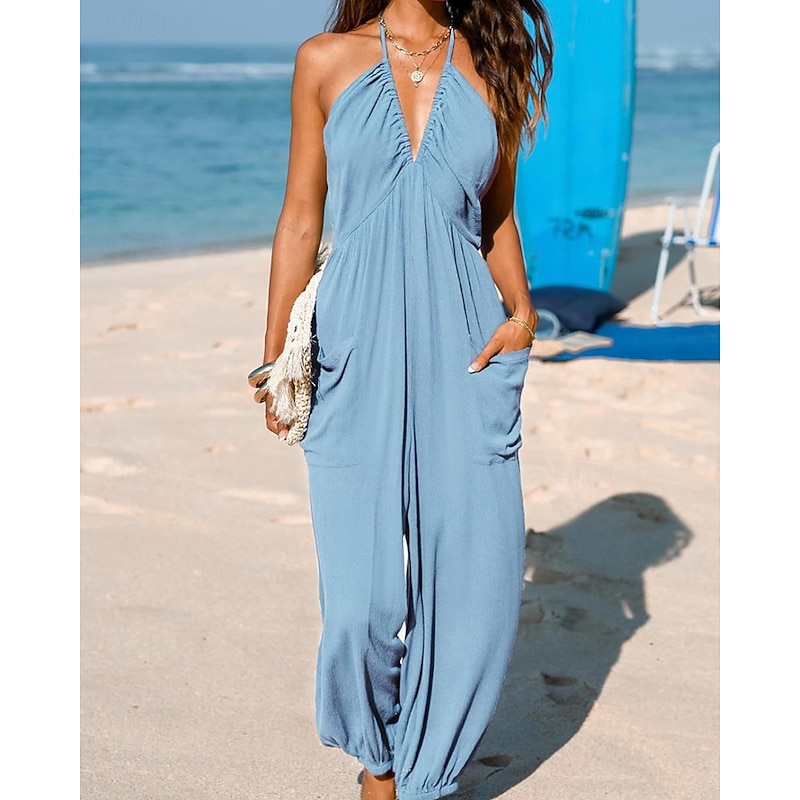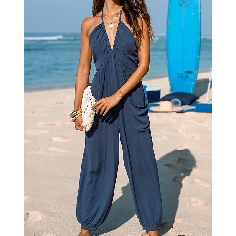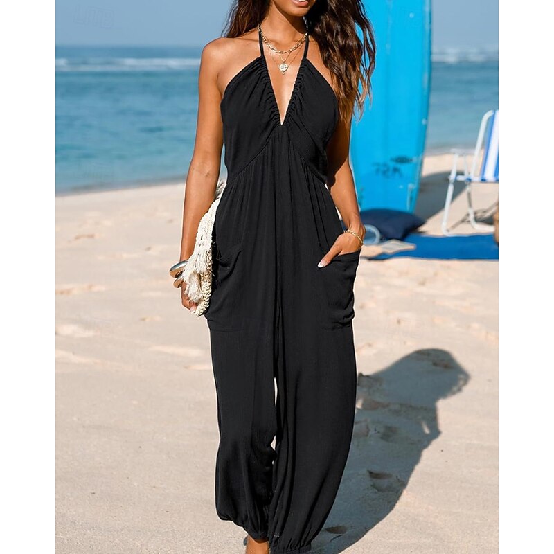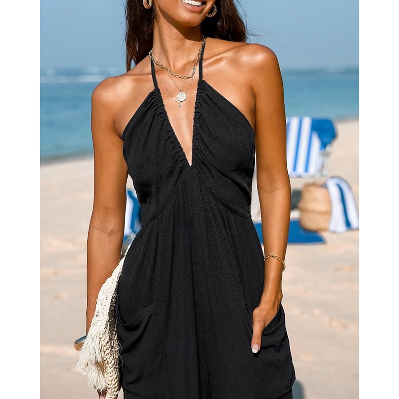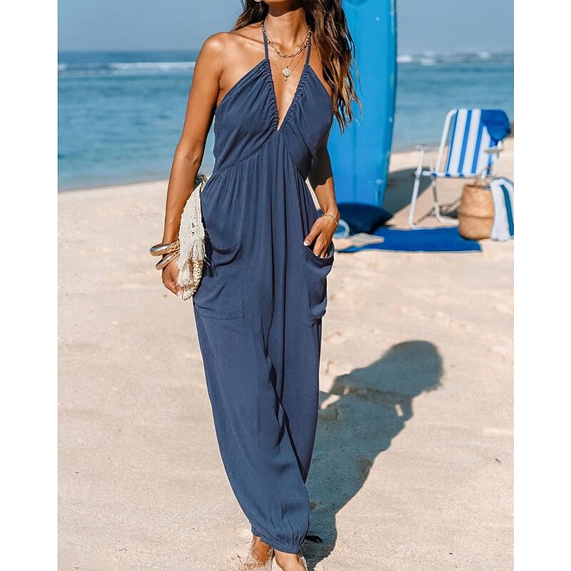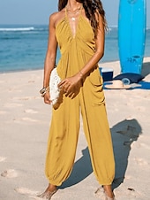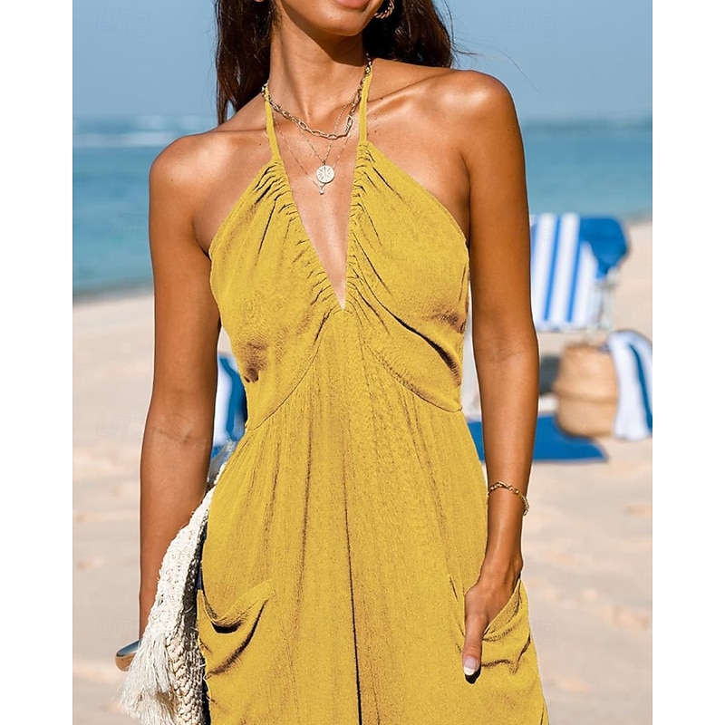 More information about Women's Normal Jumpsuit Streetwear Solid Color Sleeveless Halter Neck Pocket Street Daily Regular Fit Black Yellow Navy Blue Summer