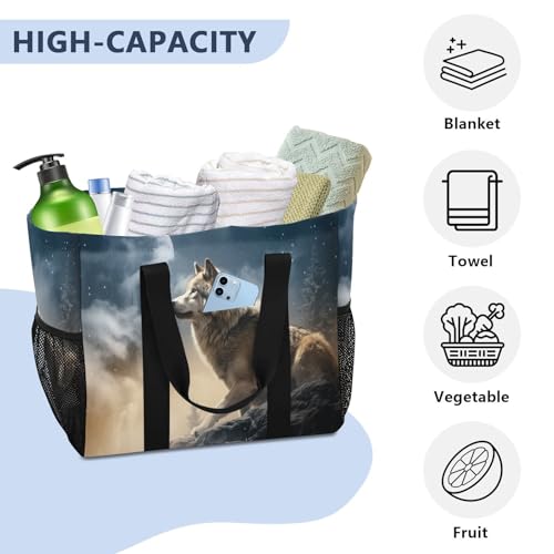HOT ! YETTASBIN Wolf Large Foldable Travel Tote Bag, Lightweight Waterproof Swim Pool Bag with Handles & Pocket for Beach Outdoor, Reusable Grocery Bag for Kitchen, Shopping