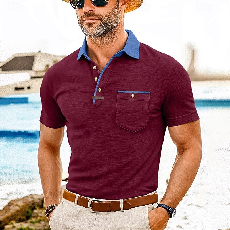 Men's Polo Golf Shirt Business Casual Classic Short Sleeve Fashion Solid Color Buttons Pocket Summer Spring Regular Fit Forest Green Denim Blue Black White Dark Red Burgundy Polo 6