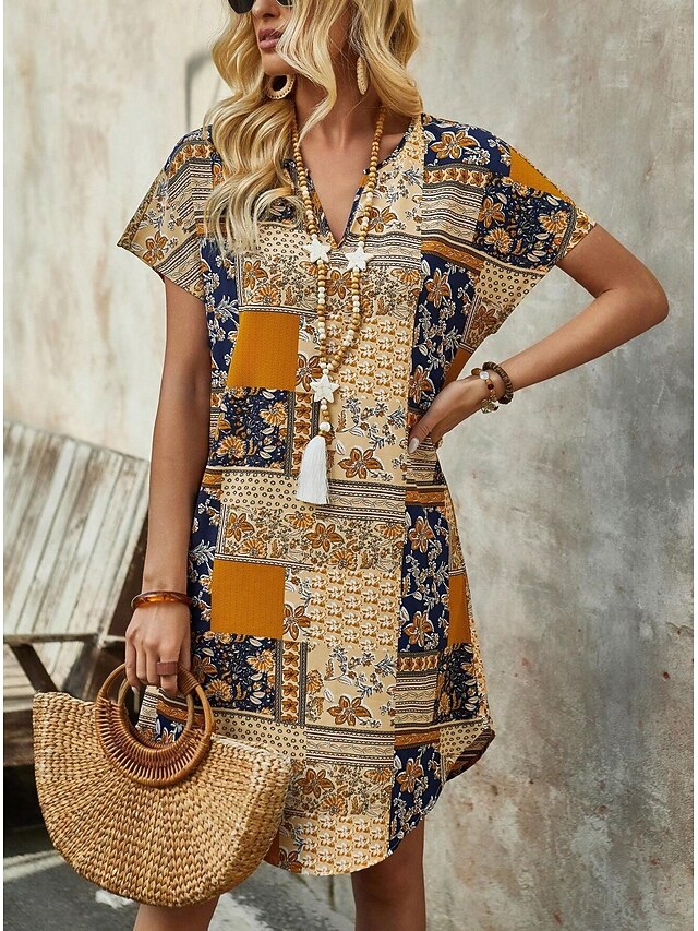 Women's Mini Dress Petite Dress Vintage Dress Boho Dress Bohemia Vintage Stylish Vacation Daily Loose Fit Floral Short Sleeve V Neck Yellow Summer 1