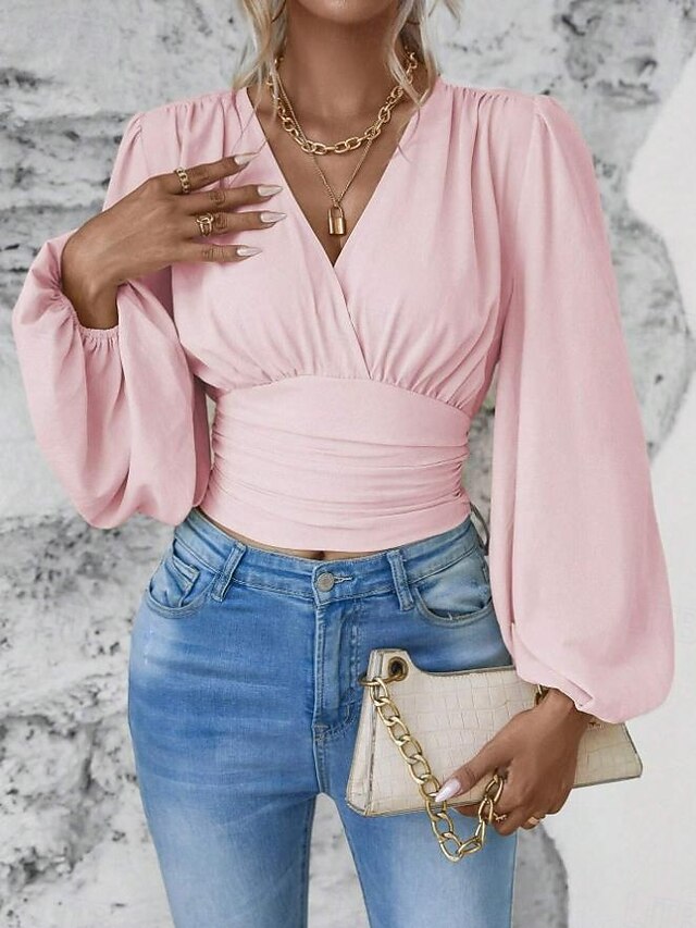 Women's Blouse Stylish Modern Solid Color Ruched Bell Sleeve Long Sleeve V Neck Work Daily Black White Pink Green Spring Fall Winter 9