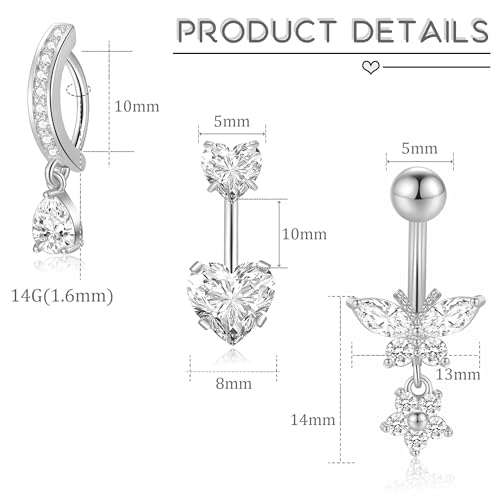 • 【Belly Button Ring Set】: One order includes 9pcs silver small short belly button ring: 3pcs clicker belly button ring, 1pc butterfly belly button piercing, 1pc heart/pearl belly button rings, 3pc cz belly rings, so many cute belly button rings for women to choose and match for your outfit.