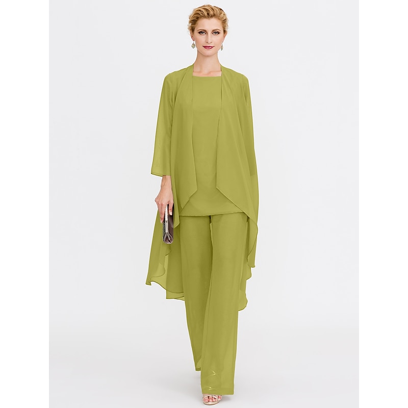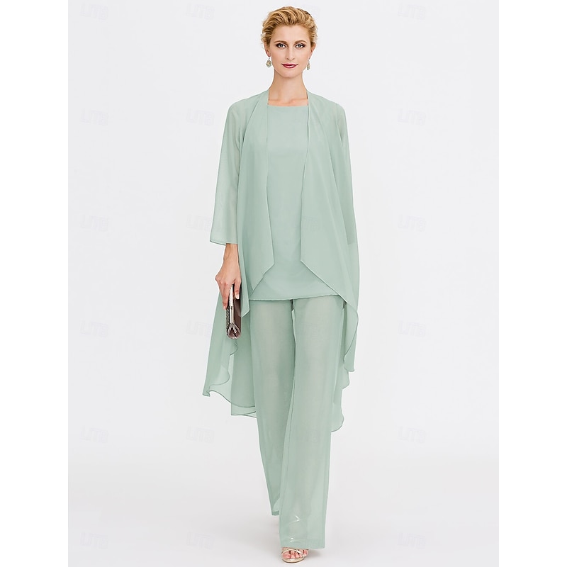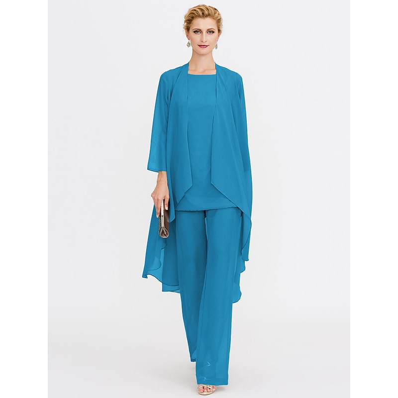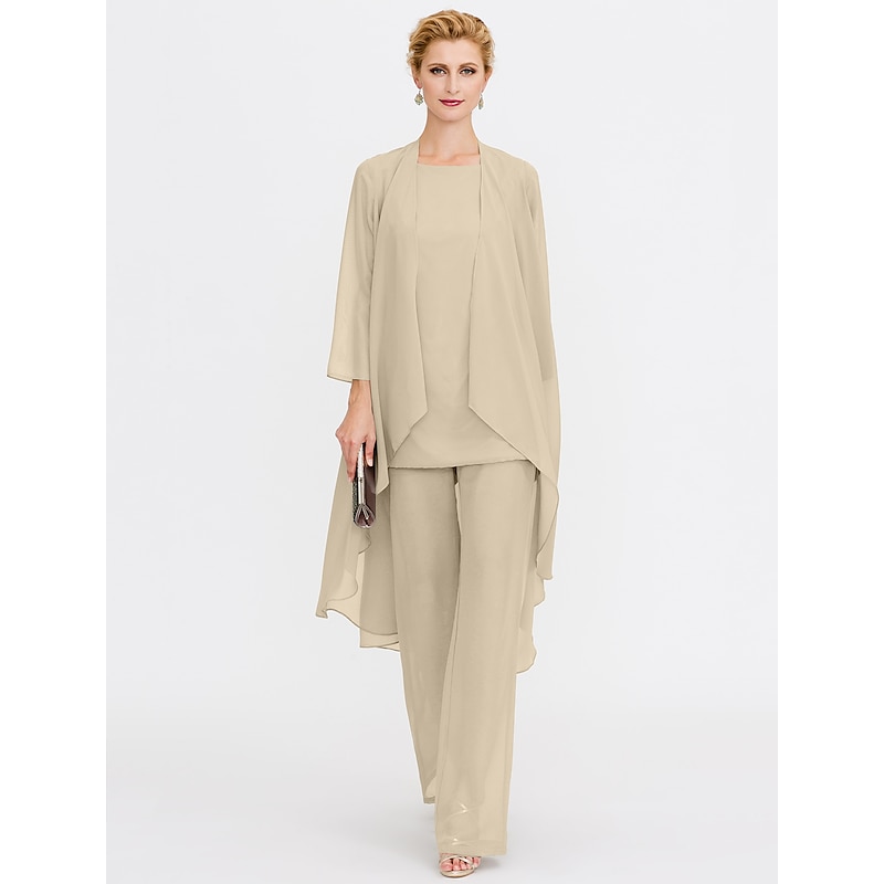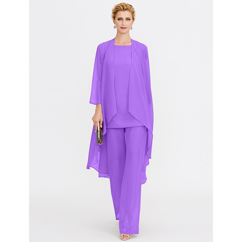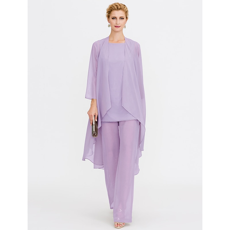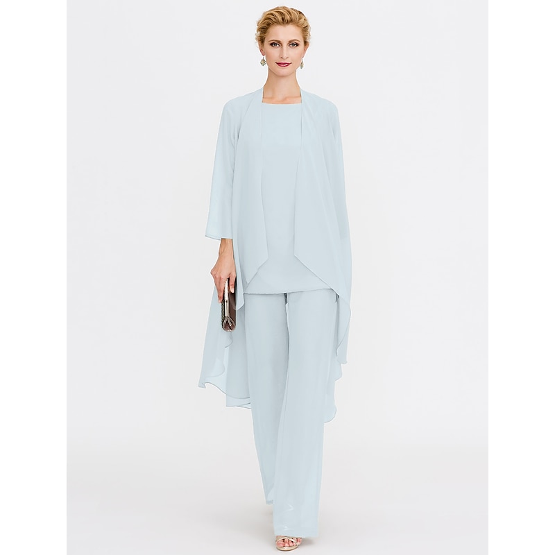 Beach Wedding Pantsuit 3 Piece Mother of the Bride  Wedding Guest Elegant Plus Size Included Bateau Neck Floor Length Chiffon Sleeveless Jacket es with Solid Color 21