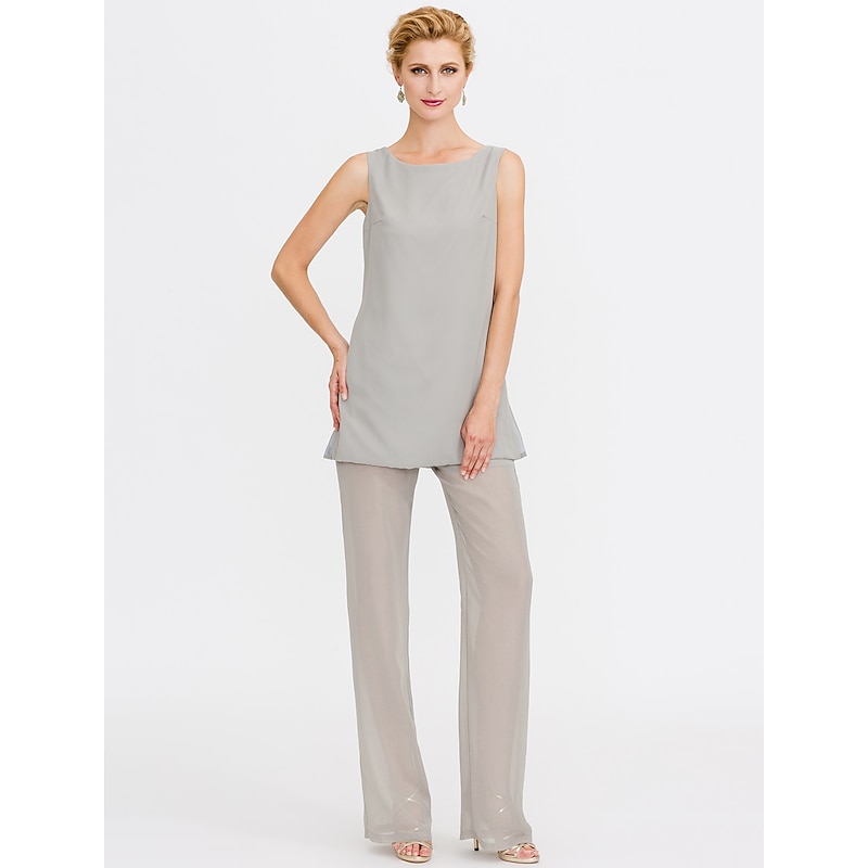 Beach Wedding Pantsuit 3 Piece Mother of the Bride  Wedding Guest Elegant Plus Size Included Bateau Neck Floor Length Chiffon Sleeveless Jacket es with Solid Color 49