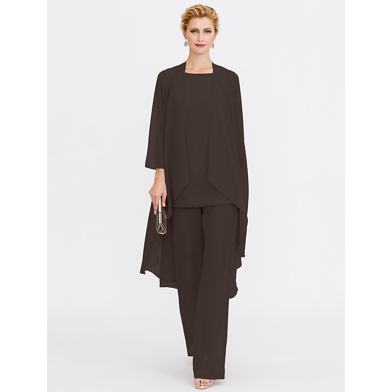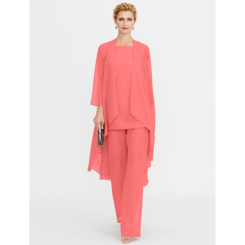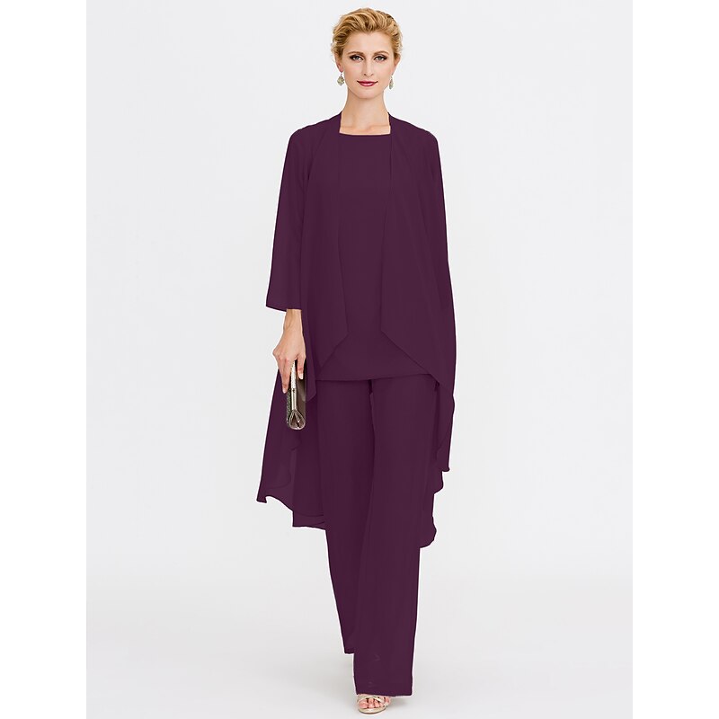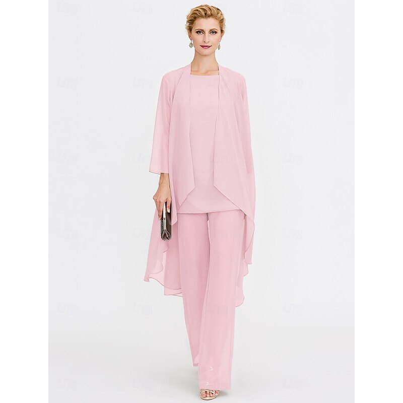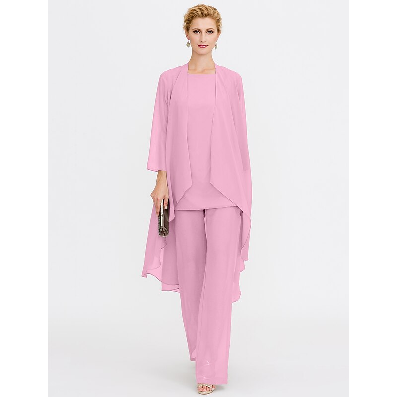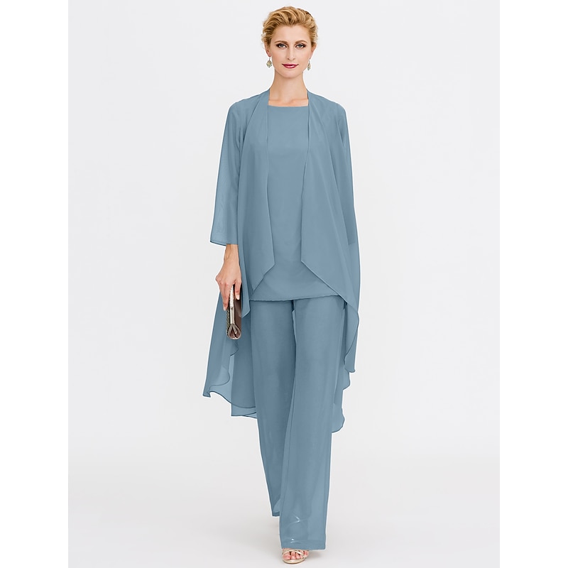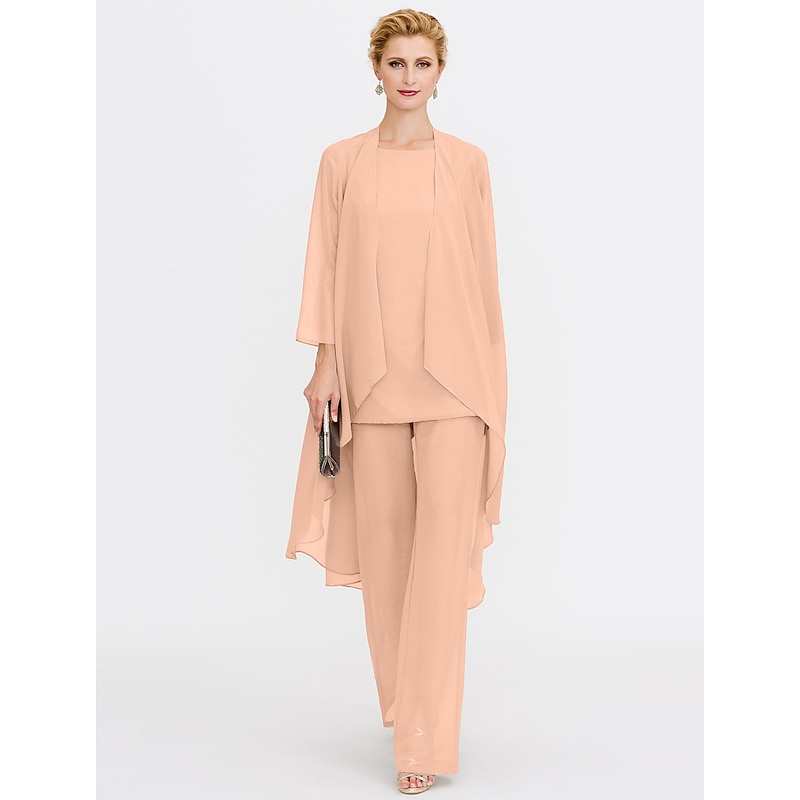 Beach Wedding Pantsuit 3 Piece Mother of the Bride  Wedding Guest Elegant Plus Size Included Bateau Neck Floor Length Chiffon Sleeveless Jacket es with Solid Color 41