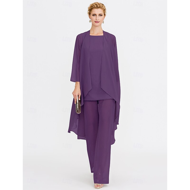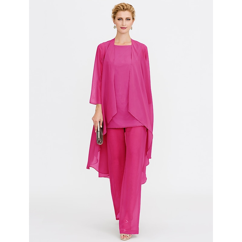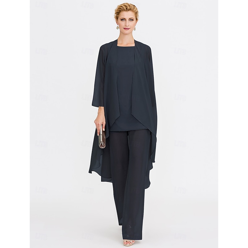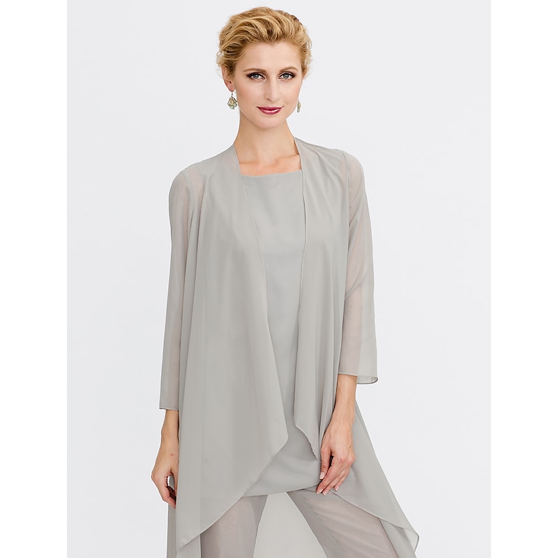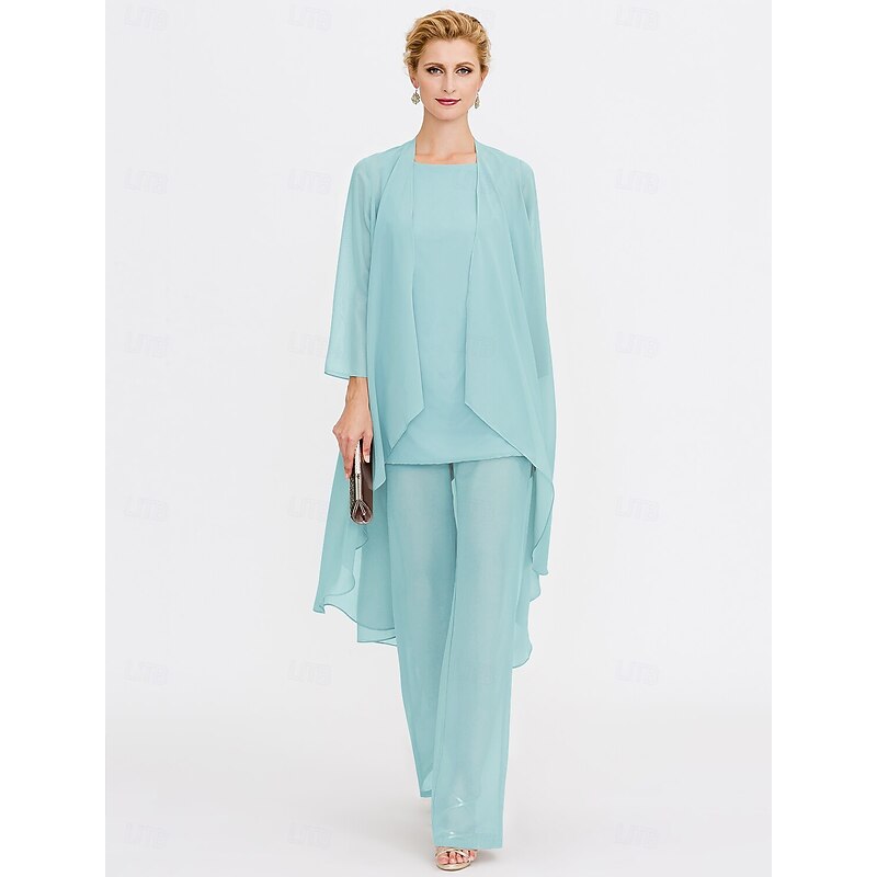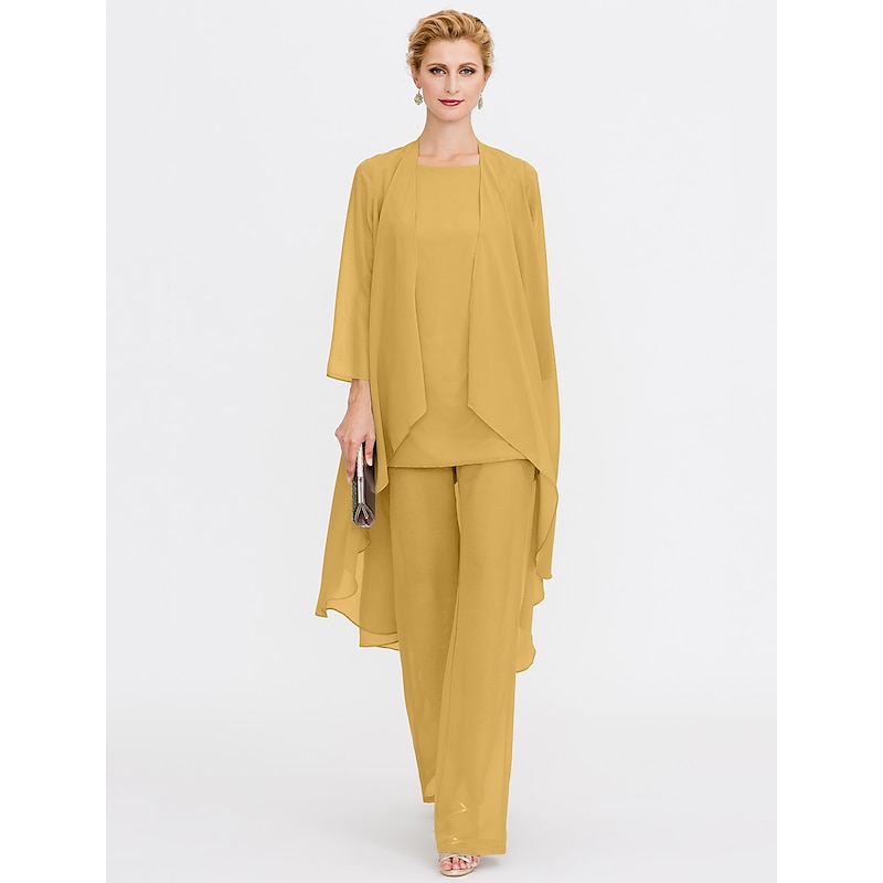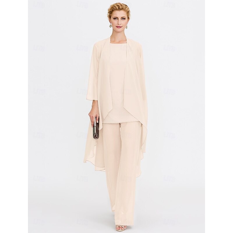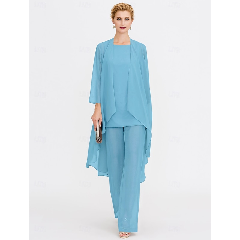 Beach Wedding Pantsuit 3 Piece Mother of the Bride  Wedding Guest Elegant Plus Size Included Bateau Neck Floor Length Chiffon Sleeveless Jacket es with Solid Color 41