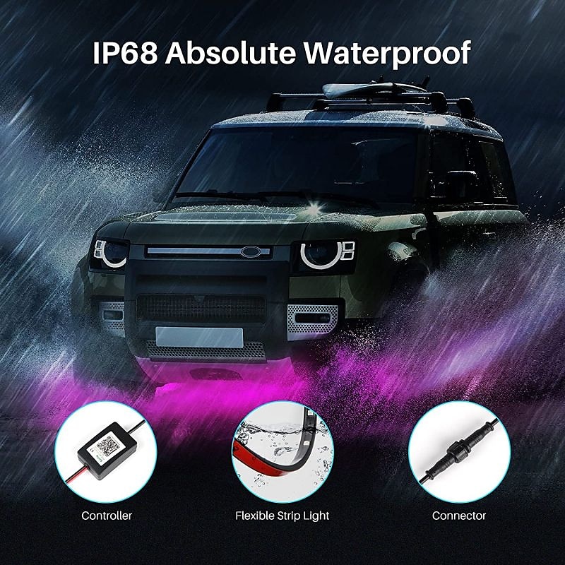 WAZA Car Underglow Lights Exterior Kit 4PCS Underbody LED Strip Lights 8 Color Sound Active Function and Wireless Remote Control with 6FT Extension Wire Cable Tie IP68 2