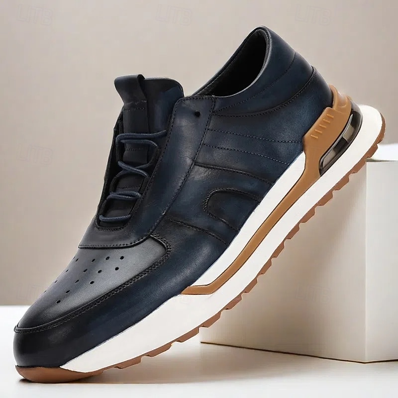 More information about Men's Navy Blue Leather Sneakers – Stylish Lace-Up Casual Dress Shoes with Brogue Detailing for Daily Wear