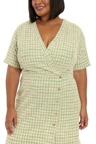 • Plus size dress, wrap dress, and short dress design featuring a V-neckline with decorative gold buttons along the side seam, short kimono-style sleeves, and a flattering knee-length cut that creates an elegant silhouette for comfort and movement