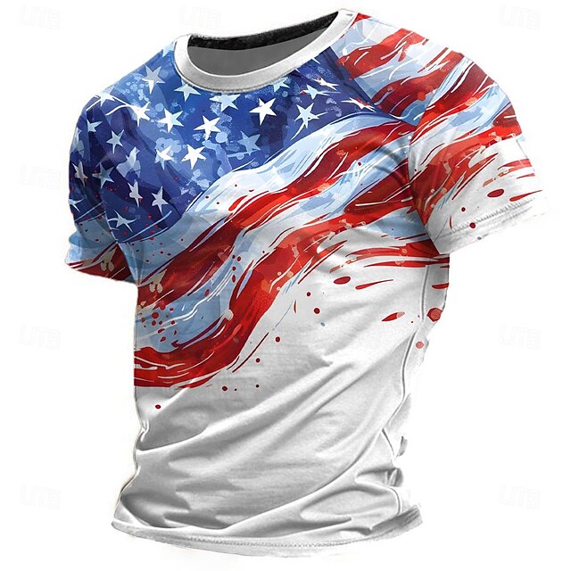 Highlights [Fabric] : Crafted from a soft, breathable polyester fabric, this men's t-shirt offers both comfort and durability, perfect for spring and summer days. The micro-elastic attribute ensures a snug, tailored fit, keeping you comfortable all day long. [Fit] : Featuring a classic crew neck and short sleeves, this t-shirt boasts a tailored fit that suits a range of body types. The regular fit design makes it an ideal choice for everyday wear or special occasions. [Design Highlights] : This t-shirt stands out with its vibrant 3D print inspired by the American flag, featuring bold red and blue hues against a backdrop of white stars. The modern, artistic twist on a traditional design adds a distinctive flair, making it a standout piece for any wardrobe. [Occasions] : Perfect for American Independence Day celebrations, street parties, casual outings, and birthday festivities, this t-shirt embodies a street style aesthetic and patriotic spirit. It's an excellent choice for those looking to make a bold fashion statement at any event. [Size Range] : Available in a wide range of sizes from S to XXXL, this t-shirt caters to a diverse audience. The versatile sizing ensures that everyone can express their style and patriotism comfortably.