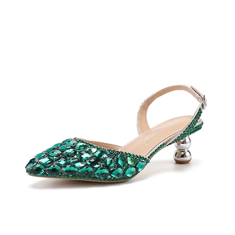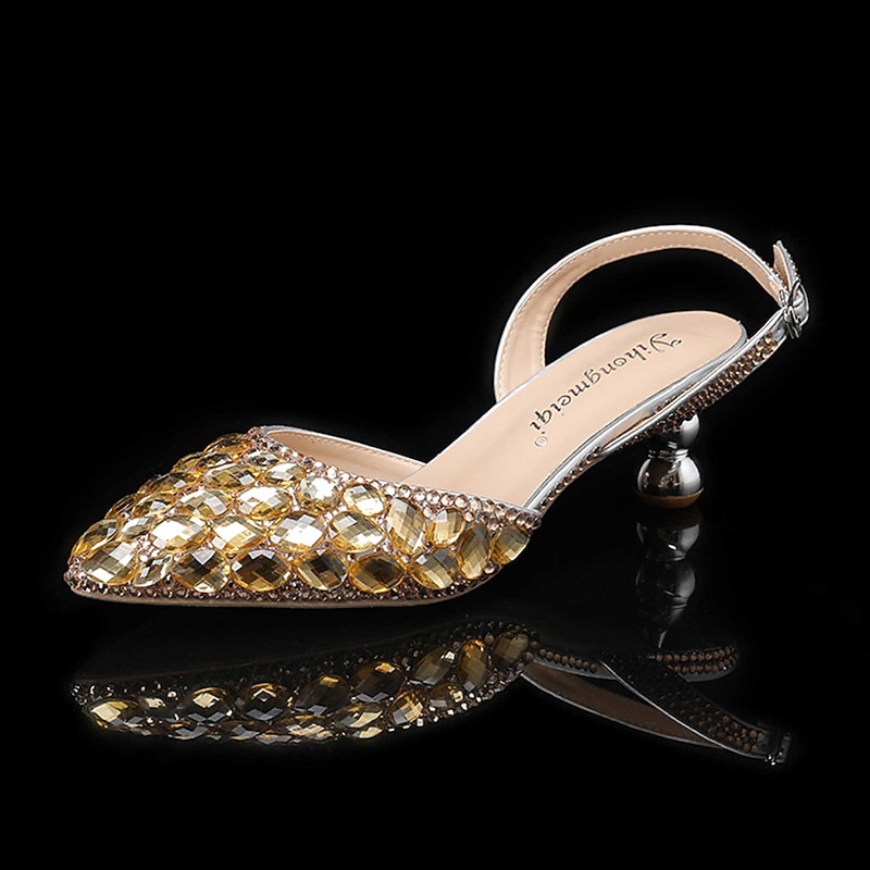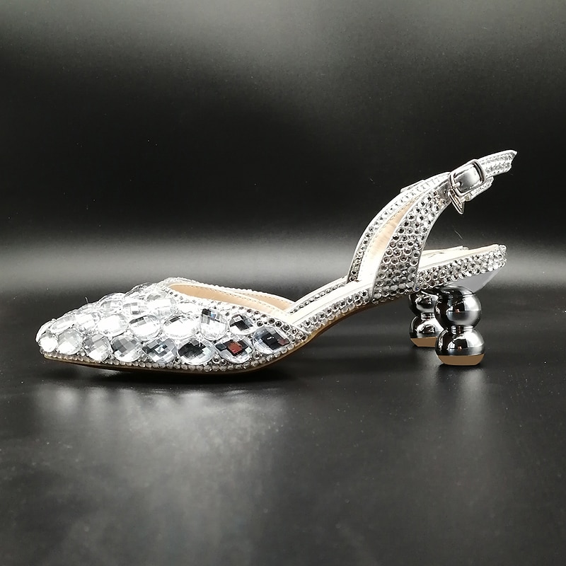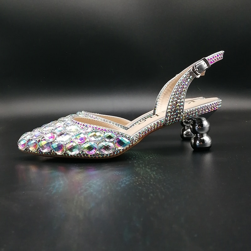 : These heels stand out with their striking rhinestone and sequin details that catch the light beautifully, enhancing their glamorous appeal. The slingback design and fantasy heel ensure modern elegance, while the secure buckle closure offers added support.