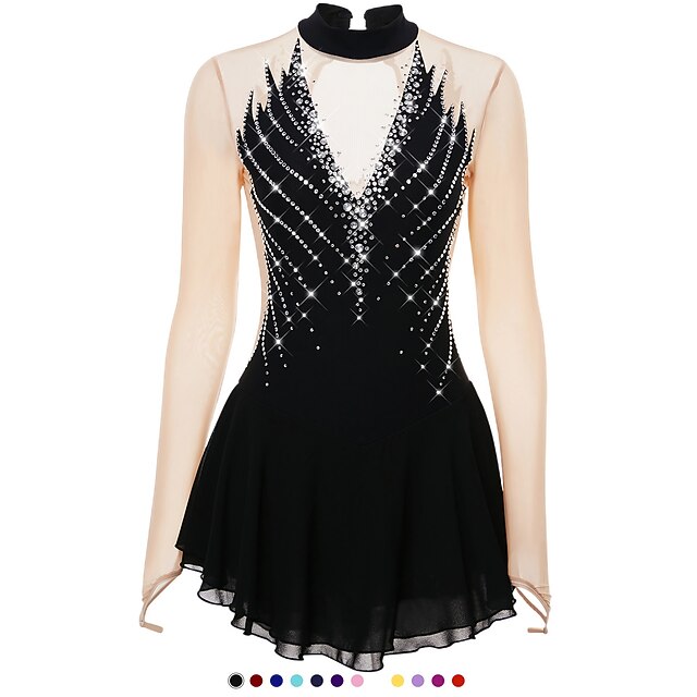 Figure Skating Dress Women's Girls' Ice Skating Dress Outfits Black Yellow Dark Purple Open Back Mesh Spandex High Elasticity Professional Competition Skating Wear Crystal / Rhinestone Long Sleeve 11