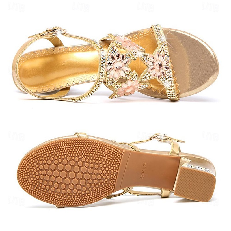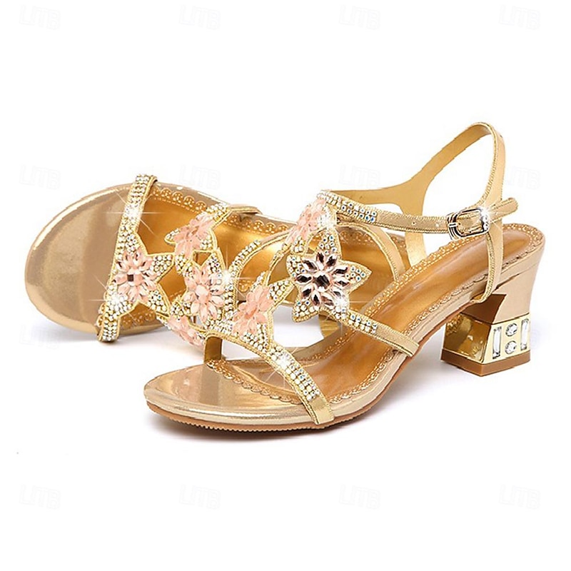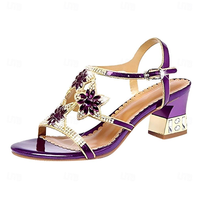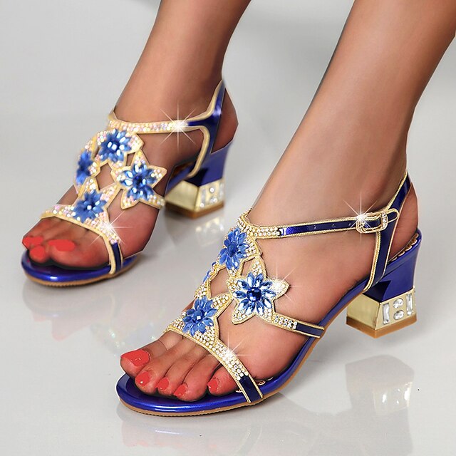 Highlights [Fabric] Crafted from high-quality faux leather, these women's sandals offer a luxurious feel with floral patterns embellished with rhinestones and crystals. The vibrant blue color and gold accents contribute to their elegant and striking appearance. [Silhouette] Featuring a chic open-toe design, these sandals boast a low, flare heel between 2 to 3 inches in height, providing both style and stability. The block-shaped heel enhances ease of movement, making them comfortable for extended wear. [Design Highlights] The elegant design of these sandals is accentuated by delicate strap detailing and adjustable side buckles, ensuring a secure fit. Decorative flower embellishments with sparkling blue rhinestones add a sophisticated touch, while the subtle gold accents elevate their luxurious look. [Occasions] Ideal for special occasions, evening outings, or even daily wear, these sandals effortlessly combine chic design with comfort. Perfect for adding a touch of elegance to any ensemble, they are suitable for both formal events and relaxed gatherings. [Size Range] Available in a variety of sizes ranging from US4-4.5 to US9, these sandals cater to a wide range of foot sizes, ensuring a perfect fit for every wearer.