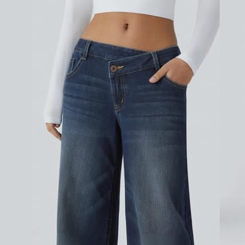 More information about Asymmetric Low Rise Zipper Pockets Baggy Wide Leg Washed Casual Jeans Crossover Wide Straight Leg Denim Pants