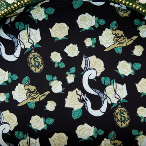• Loungefly Harry Potter Slytherin House Tattoo Mini Backpack is made of vegan leather (polyurethane). Backpack has adjustable shoulder straps, side pockets, and gold-colored hardware. Additional features include applique, printed, Saffiano vegan leather, foil, and debossed details. Take note of the coordinating inside lining. This backpack is an officially licensed Harry Potter product.