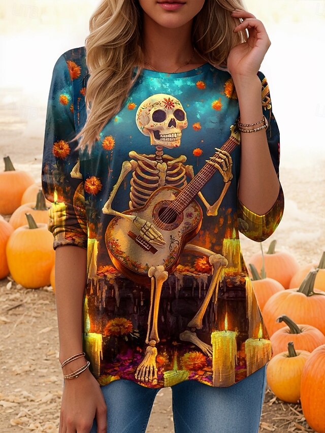 HOT ! Halloween Women's T Shirt Skulls Crew Neck Long Sleeve Tunic Graphic Vintage Casual Regular Tops Daily Print Sage Green Blue Dusty Blue Spring Fall