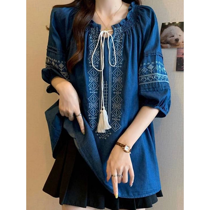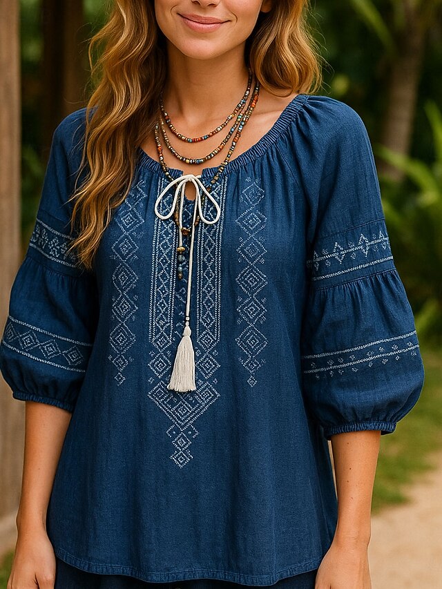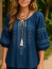 More information about Women's Blouse Solid Color Vintage Ethnic Casual 3/4 Length Sleeve Crew Neck Regular Tops Daily Ruched Embroidered Print Navy Blue Summer