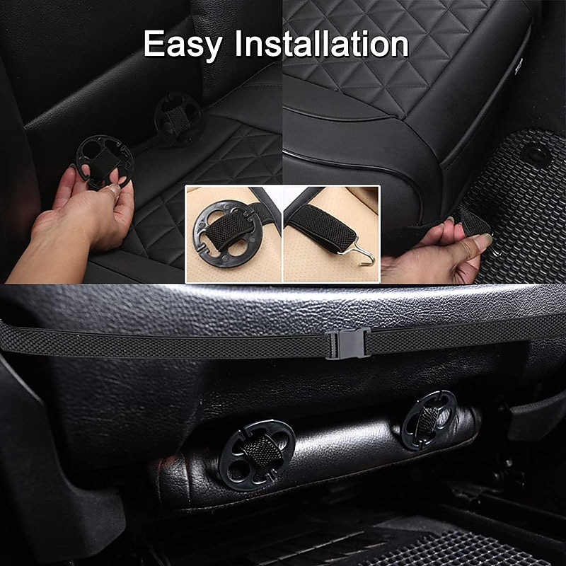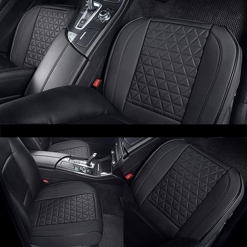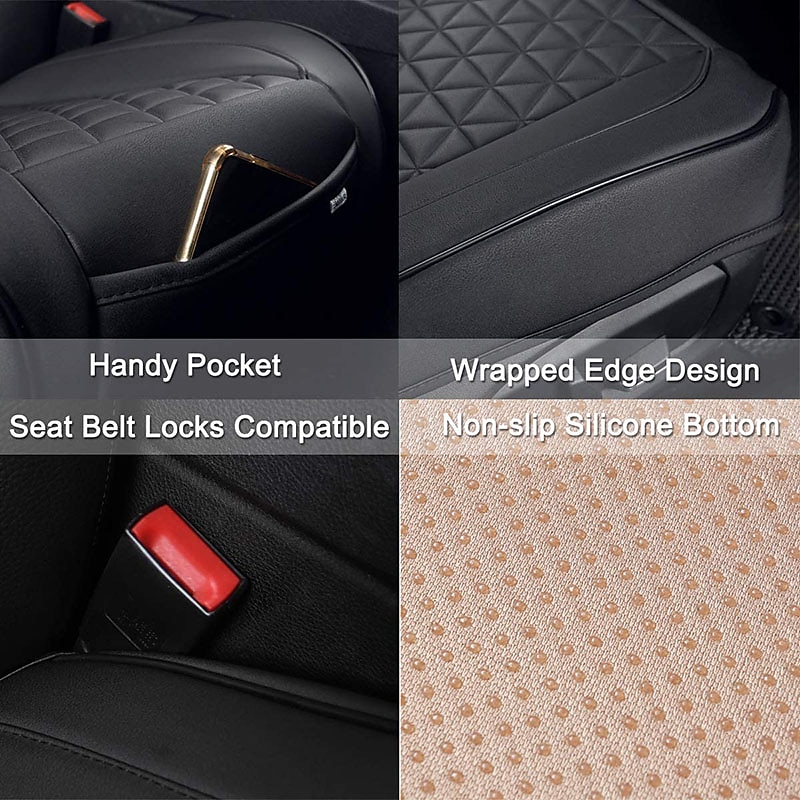 Highlights - Upgraded wear-resistant leather material for excellent durability and water resistance - Provides effective protection against fading and wear of the original car seat - Built-in high rebound sponge for added comfort during long drives - Wrap around design of the bottom seat covers for full protection and seamless integration with original seats - Handy little front pocket for storing small items like phone - Non-slip gel bottom for secure placement and durable chucks and hooks to ensure the seat cover stays in place - Elegant triangle quilted design for a unique and stylish car interior - Slightly raised triangle pattern for added comfort - Easy installation in about 5 minutes through chucks insertion, hook securing, and buckle use.