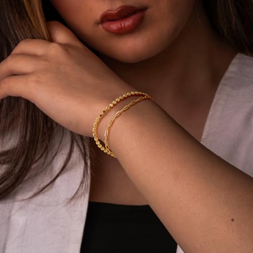 • [CHIC LAYERED DOUBLE CHAIN DESIGN] This gold bracelets for women features a double-chain structure of a flat bead bracelet and a dainty gold paperclip bracelet, enhancing the rich sense of layering and modern design appeal of the gold bracelet