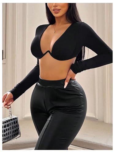 SweatyRocks Women's Deep V Neck Long Sleeve Underwire Crop Tops Super Crop Tee Shirt 1