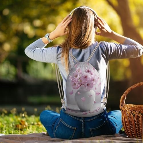 White Vase with Pink Cherry Drawstring Backpack Canvas String Bag Lightweight Sports Gym Bag for Men Women 6