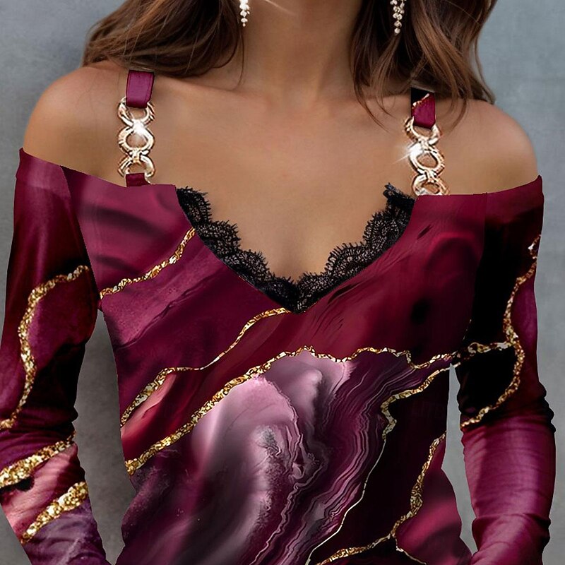 Highlights [Fabric and Fit] This Women's Shirt Blouse is crafted from a high-quality polyester blend, offering a silky and luxurious texture with micro-elasticity for a comfortable fit. The blouse features a regular fit and regular length, making it suitable for a variety of body types. [Design Highlights] The blouse boasts an eye-catching abstract print in rich burgundy and gold tones. It features a fashionable cold shoulder V-neck design complemented by long sleeves. The neckline is elegantly trimmed with delicate black lace, while stylish metallic chain details adorn the straps, adding a chic touch to the overall design. [Versatile Occasions] Ideal for both casual and fashionable settings, this top is perfect for spring and fall events. Whether attending a day event or enjoying a night out, this blouse makes a bold fashion statement suited to various occasions. [Care Instructions] Designed for easy maintenance, the blouse can be machine washed, and is suitable for both wet and dry cleaning. This ensures the garment remains in excellent condition even with regular use. [Available Sizes] This blouse is available in a wide range of sizes, including S, M, L, XL, and 2XL, offering a suitable fit for many different body shapes and ensuring everyone can enjoy this stylish piece.