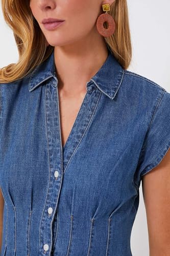 • Feature: Women's jean shirt dress features waist pleating, short cap sleeves, collar with v-neckline, A-line silhouette, and midi length. Front-button closure makes it easier for you to wear