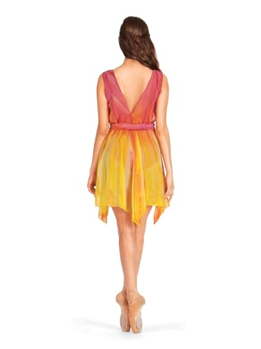 • Features include a high front neckline, a stunning open v-back, an attached handkerchief skirt and a removable sash
