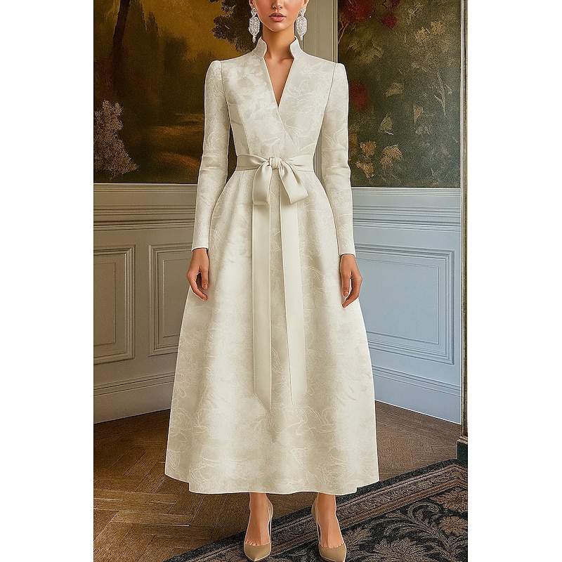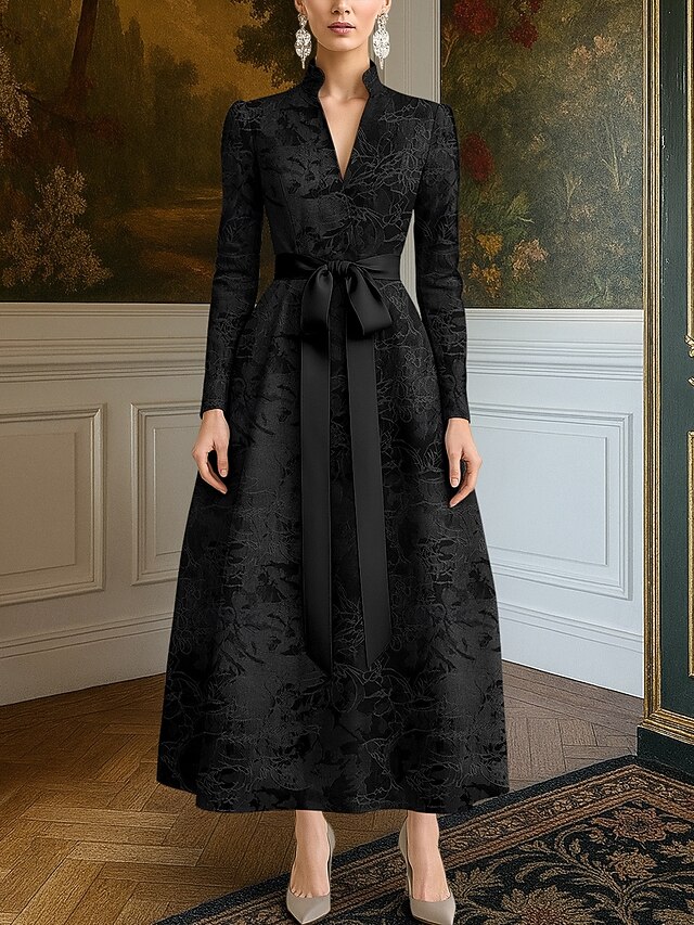 More information about Black Tie Jacquard Brocade A-Line Evening Gown Elegant Dress Formal Wedding Floor Length Long Sleeve V Neck Pocket Nylon with Bow(s) Strappy