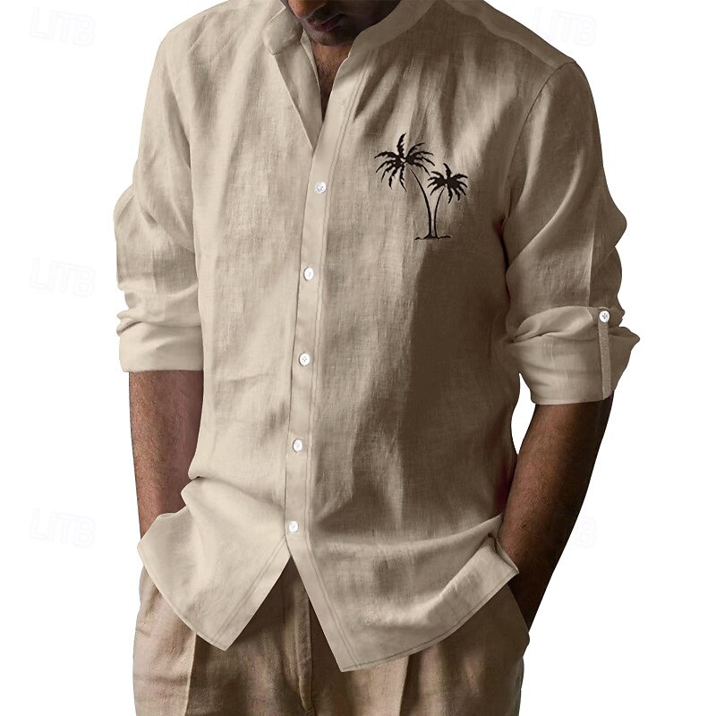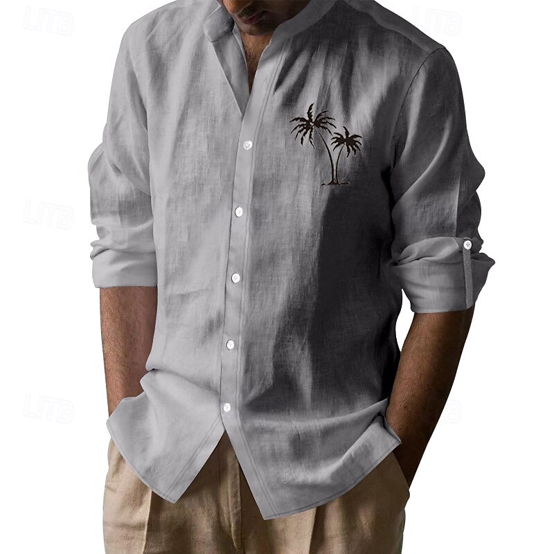 Men's Shirt Linen Shirt Casual Shirt Button Up Shirt Cotton Shirt Palm Tree Vacation Hawaiian Black White Khaki Gray Long Sleeve Band Collar Spring Fall Clothing Apparel Print 1