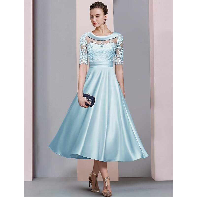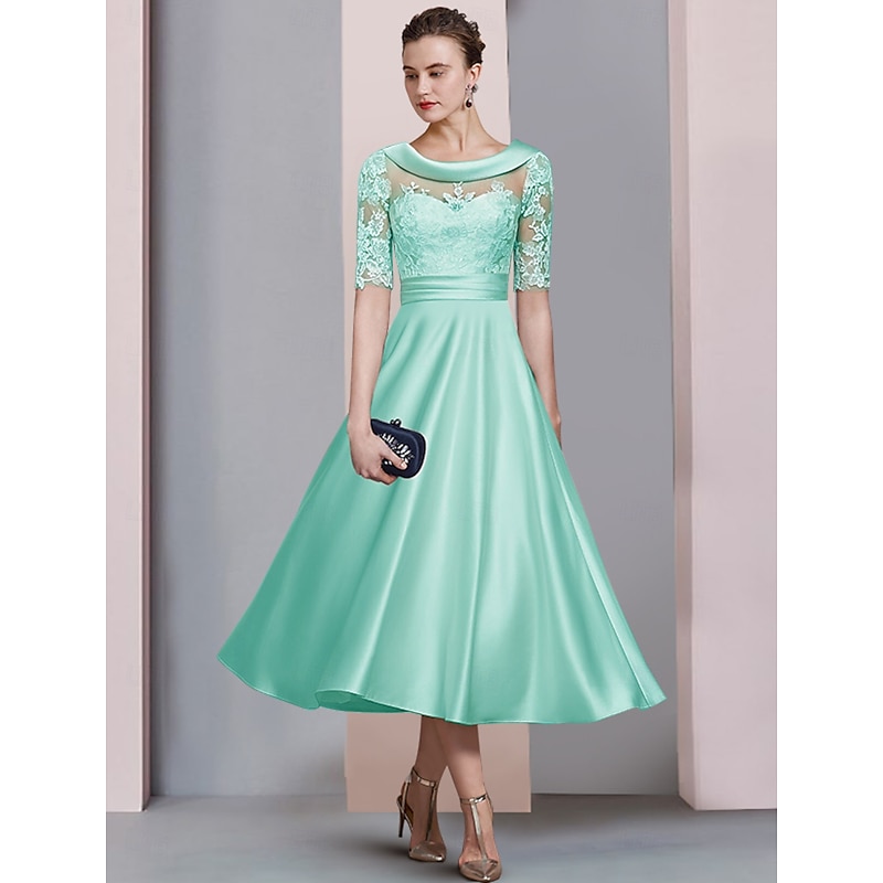 More information about A-Line Gold Mother of the Bride Dress Wedding Guest Elegant Vintage Scoop Neck Tea Length Satin Lace Half Sleeve with Ruched Appliques