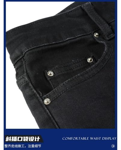 Jeans Pants Trousers Denim Men Street Trendy Stretch Tight Slim Fit Black Patch Punched Small Foot Casual 5