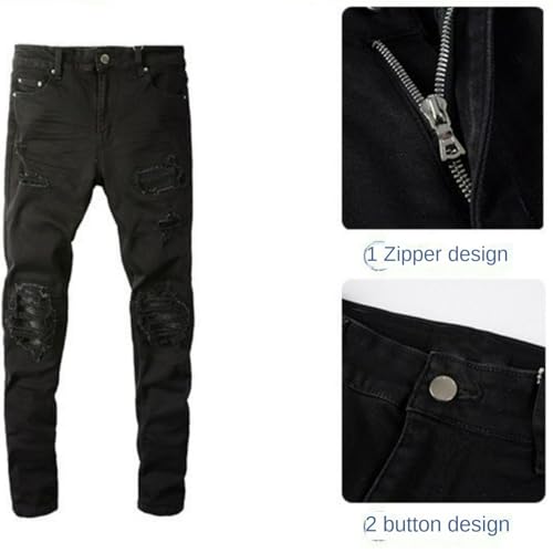 HOT ! Jeans Pants Trousers Denim Men Street Trendy Stretch Tight Slim Fit Black Patch Punched Small Foot Casual