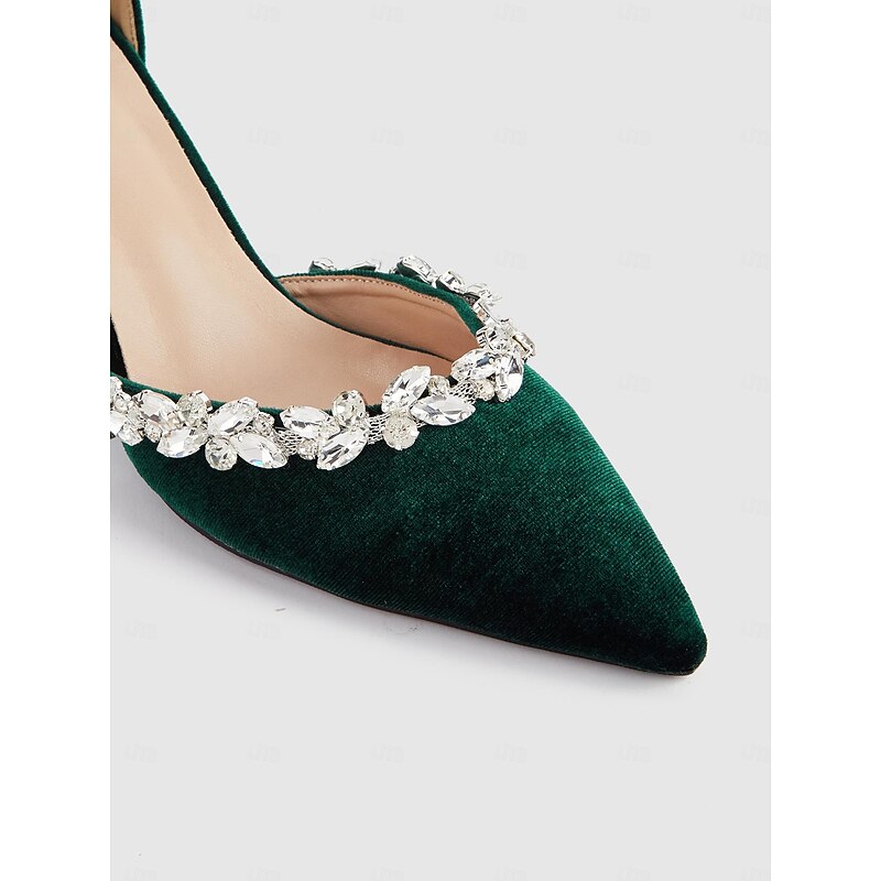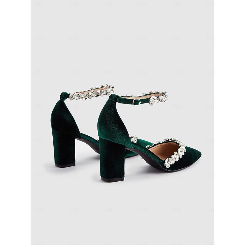 Highlights [Fabric and Material] Crafted from luxurious green velvet, these pumps offer a rich, opulent feel that's perfect for a stylish occasion. The upper is complemented by a synthetic leather lining for a comfortable wear experience. [Design and Fit] These pumps feature a sophisticated pointed-toe design and a stable chunky heel, enhancing both style and comfort. The ankle strap, adorned with sparkling rhinestones, adds a touch of glamour, while the secure buckle ensures a perfect fit. [Design Highlights] The standout feature of these pumps is the dazzling rhinestone embellishments along the ankle strap and toe, which catch the light beautifully and add an eye-catching detail to your outfit. [Occasions] Ideal for weddings, parties, and other formal events, these pumps let you make a chic statement anywhere you go. Whether you are attending a grand celebration or a classy evening gathering, they add a touch of elegance and sophistication. [Size Range] Available in standard sizes US5 to US13, these pumps are designed to fit a variety of foot sizes comfortably. Choose your usual size for the best fit.