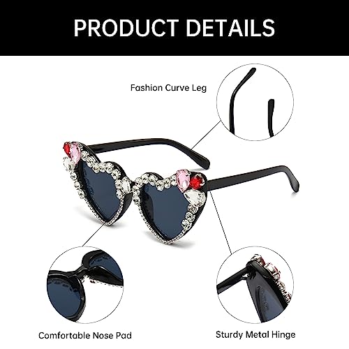 • ❤【HIGH QUALITY MATERIALS】-This pair of rhinestone heart shape Sunglasses is made of high-quality PC lenses, reinforced metal hinges, light and comfortable,Integrated nose pad design can bring you a stress-free wearing experience. All the details ensuring you a long time using.