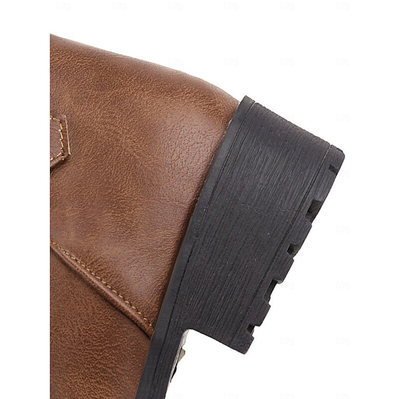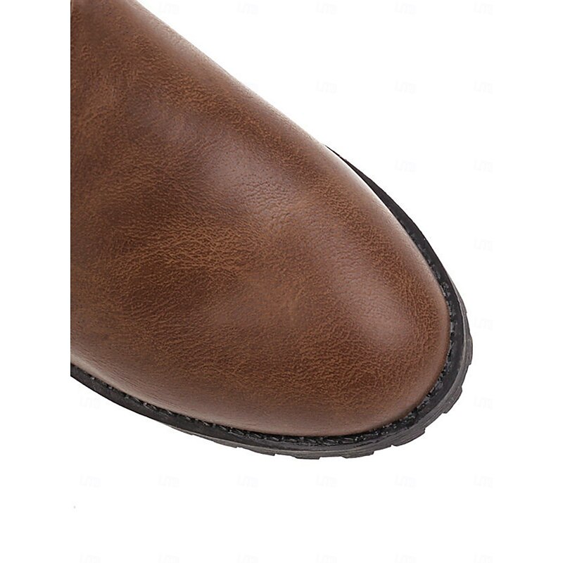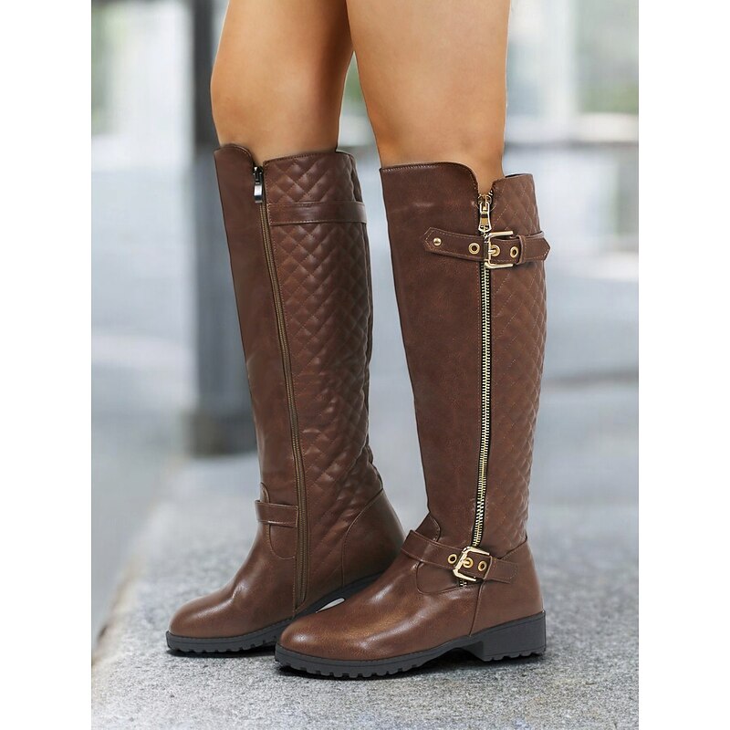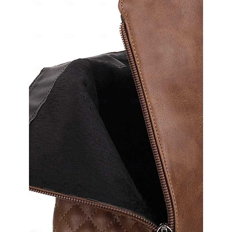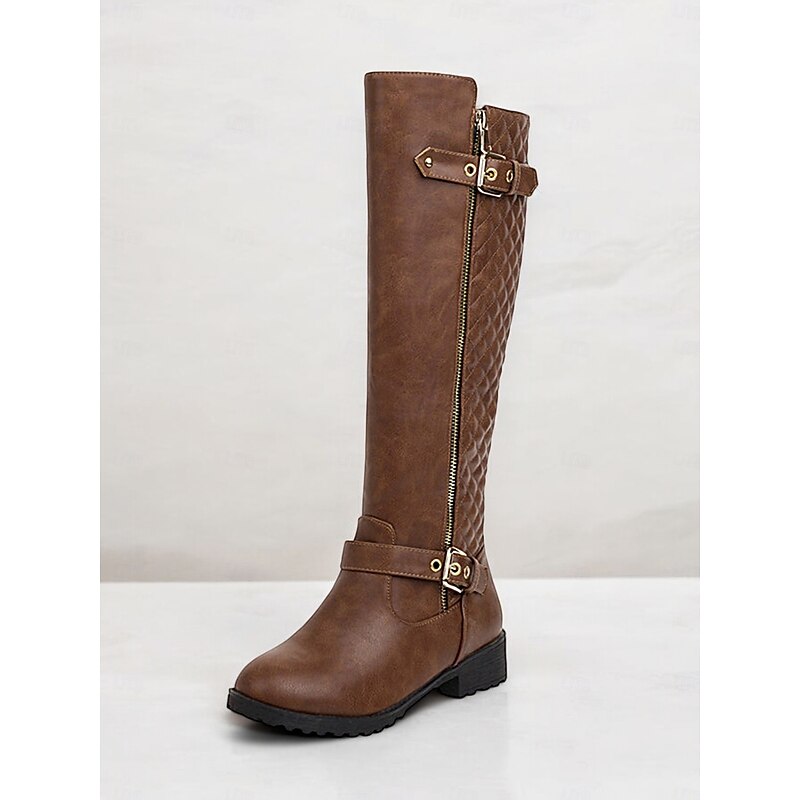 Highlights [Fabric and Material] : These stylish knee-high boots are crafted from high-quality faux leather, offering a sophisticated and durable option for your winter wardrobe. The rich texture provides both a classic look and comfortable wear. [Silhouette and Fit] : With a sleek, slightly rounded toe and a sturdy low block heel, these boots ensure comfort for all-day wear. The fleece-lined interior adds extra warmth, making them ideal for the colder months. [Design Highlights] : Featuring an elegant quilted pattern on the back, these boots speak of sophistication with their chic detailing. The functional side zipper and adjustable strap with buckle not only enhance the fit but also act as stylish accents. [Occasions] : Perfect for work, office settings, and casual outings, these boots transition effortlessly from day to night. Their versatile design pairs well with jeans, leggings, or skirts, making them a must-have for fall and winter fashion. [Size Guide] : Available in a range of sizes, from US5.5 to US10.5, these boots cater to various foot sizes, ensuring a perfect fit for everyone.