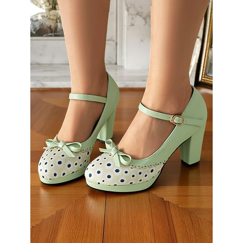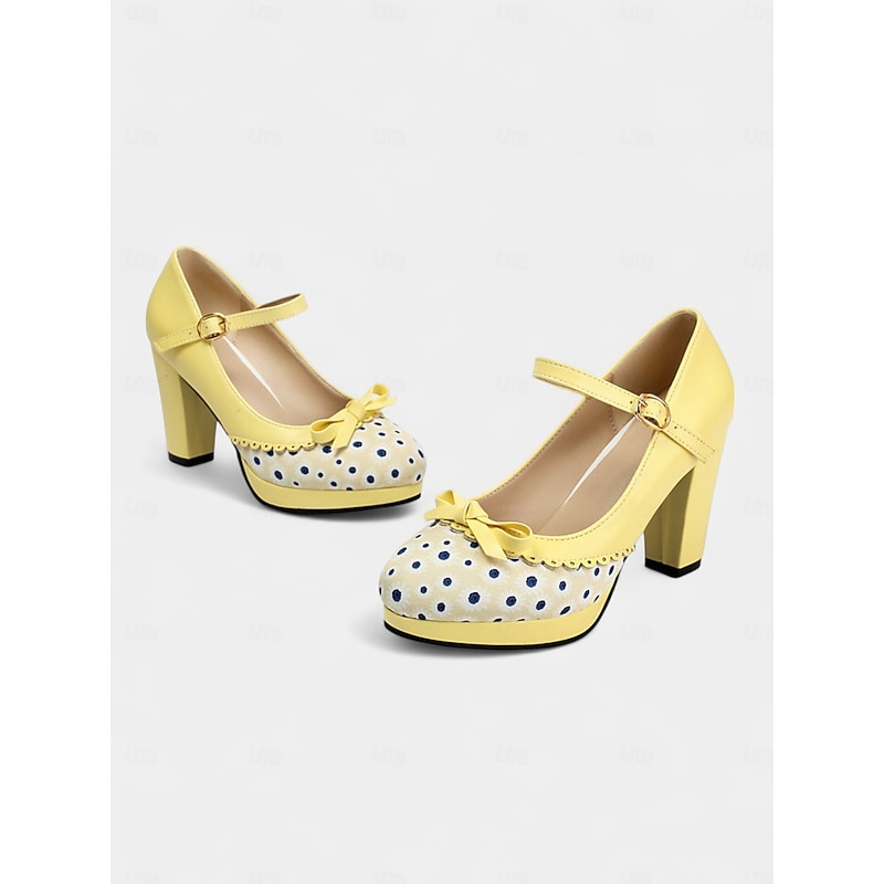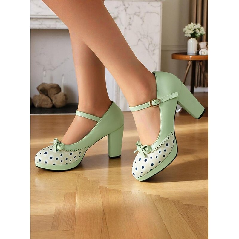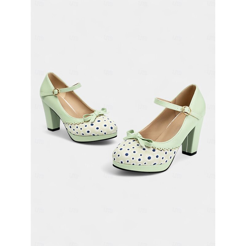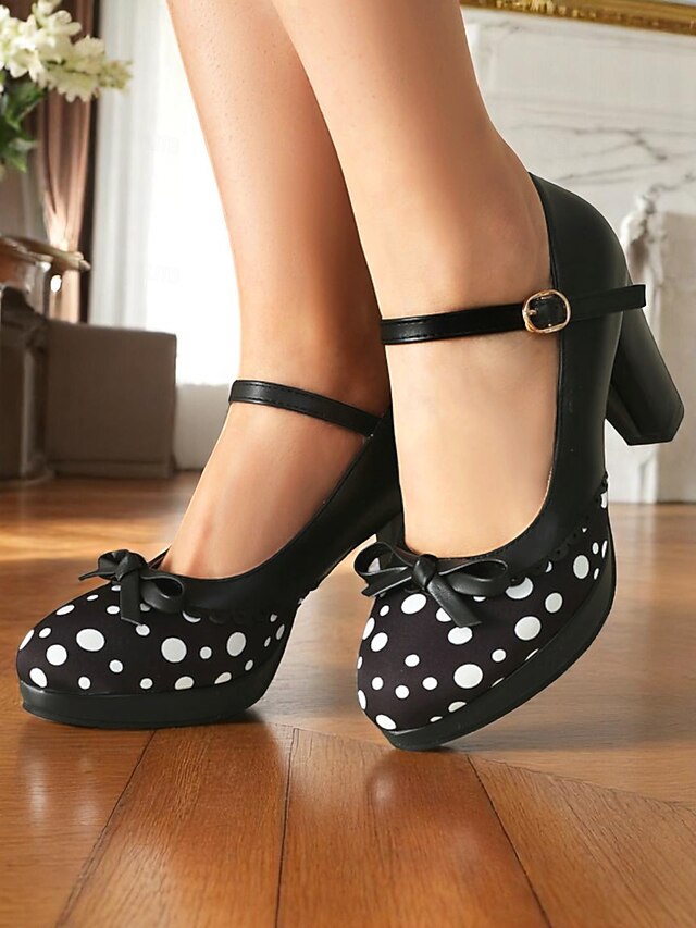 HOT ! Women's Blue Polka Dot Block Heel Mary Janes – 1950s Vintage Style with Bows, Ideal for Tea Parties, Dates & Lolita Fashion