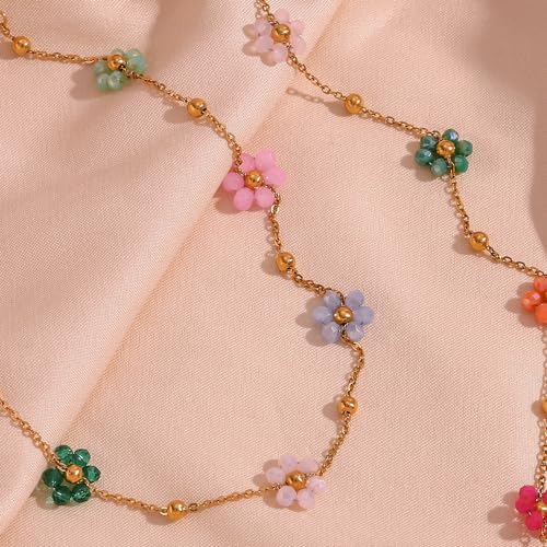 Cute Flower Beaded Ball Choker Necklace Stainless Steel Colorful Acystal Bead Daisy Flowers Adjustable Necklaces Fashion 18k Goldtone Plated Jewelry Gifts for Women Chain 15"+2" 6