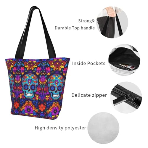 Sugar Skull Day of The Dead Flowers Women one Shoulder Bag Handbag Grocery Bags Tote Bag with Inner Pocket