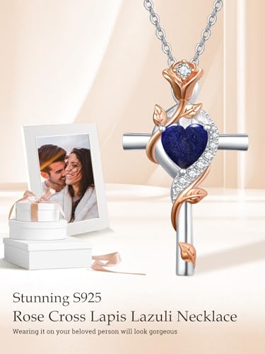 • 【Lapis Lazuli Cross Necklace-Gifts for Women】Rose cross necklace symbolizes romantic love. Cross necklace with 1 natural lapis lazuli jewelry. Chain length is 18"+2", pendant size is 0.83", Silver weight:4.2g.