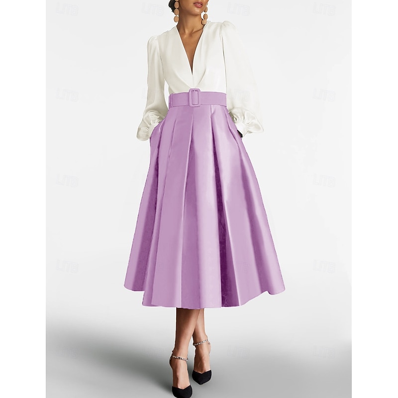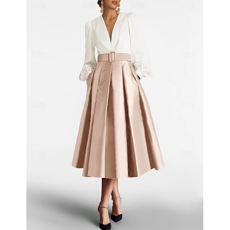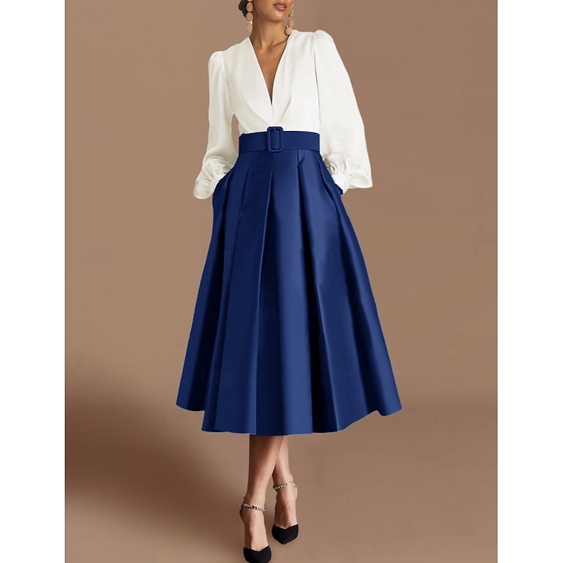 Beach Wedding A-Line Cocktail Dresses Elegant Dress Formal Wedding Guest Tea Length Long Sleeve V Neck Satin with Ruched Dresses 14