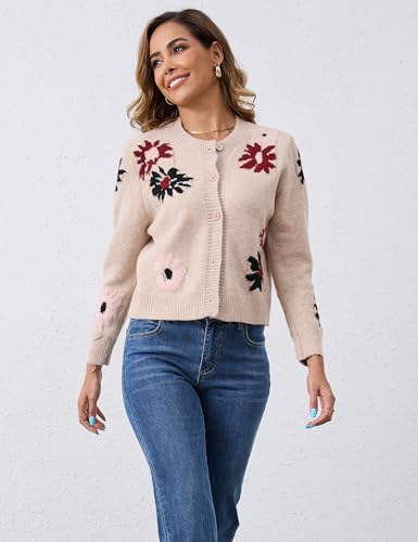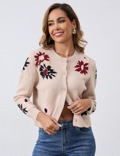 Cardigan Sweaters for Women Cropped Button Down Sweater Long Sleeve Crew Neck Knit Floral Print Outwear 1