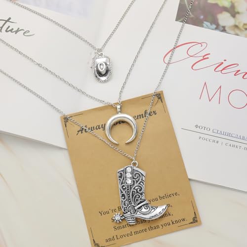 HOT ! RechicGu Layered Boho Western Cowgirl Necklace For Women Bull Head Moon Crescent Cowboy Boot Charm Pendant Western Necklace Jewelry For Country Concert Outfits
