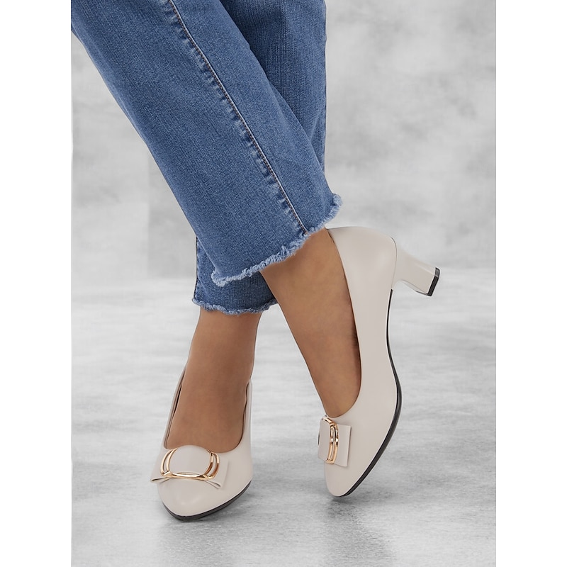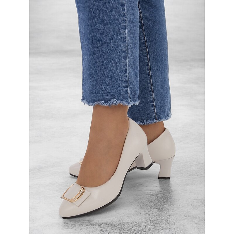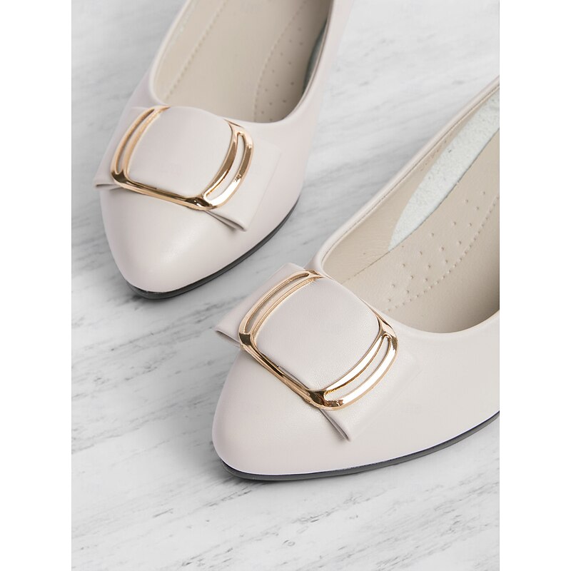 Women's Beige Low Block Heel Pumps with Gold Buckle and Flexible Sole – Comfortable Slip-On Shoes for Office and Formal Wear