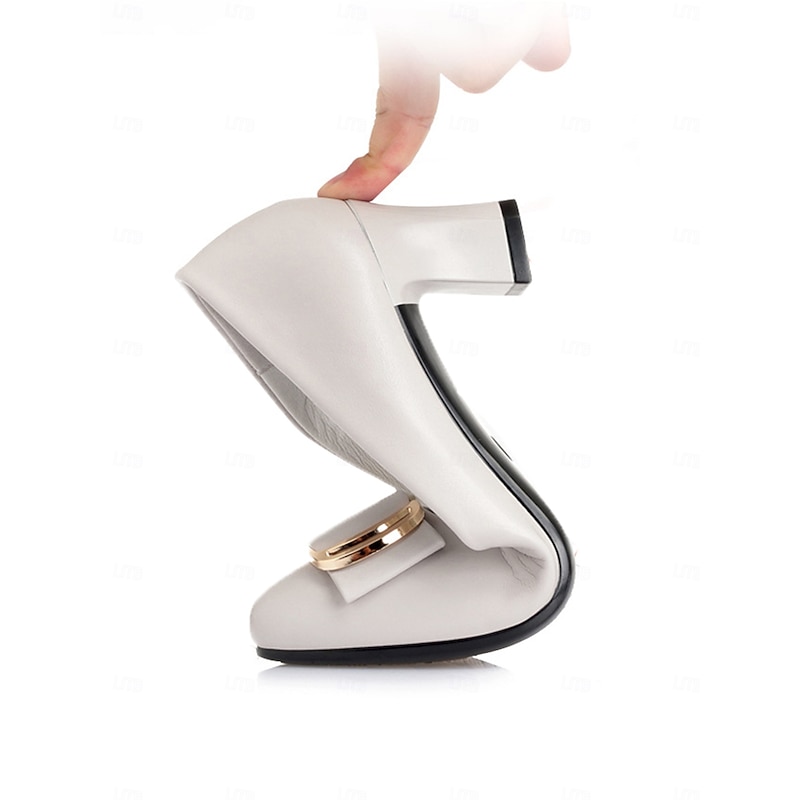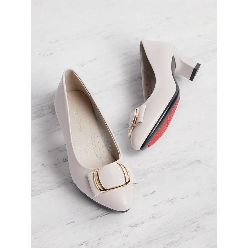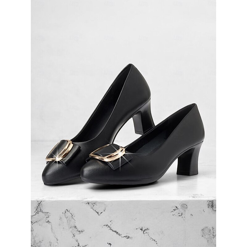 : Featuring a classic chunky heel, these pumps provide both stability and chic appeal, perfect for long hours of wear. The shoes have a pointed toe shape, adding a touch of sophistication. A decorative bow accompanied by a gold-toned buckle enhances their charm, making them suitable for various occasions. The elegant loafers design allows for easy slip-on functionality.