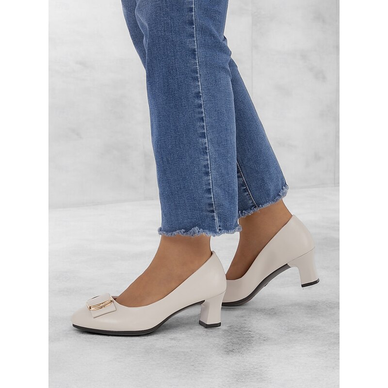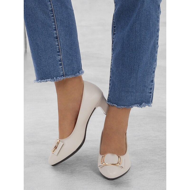 More information about Women's Beige Low Block Heel Pumps with Gold Buckle and Flexible Sole – Comfortable Slip-On Shoes for Office and Formal Wear