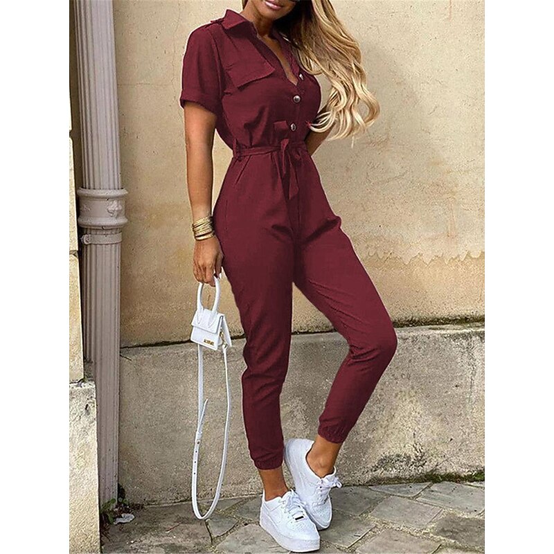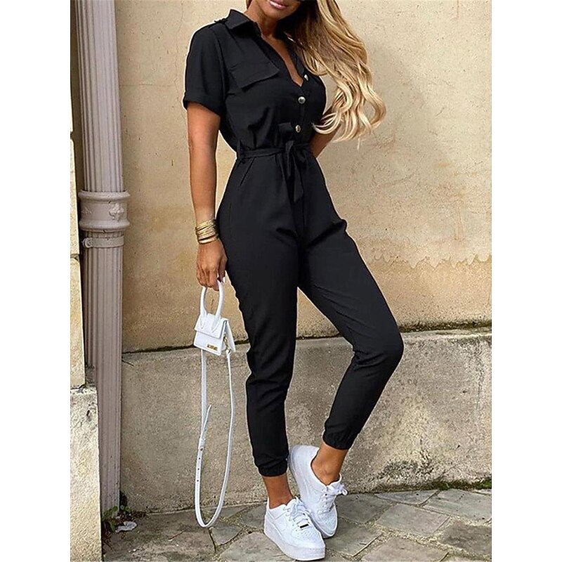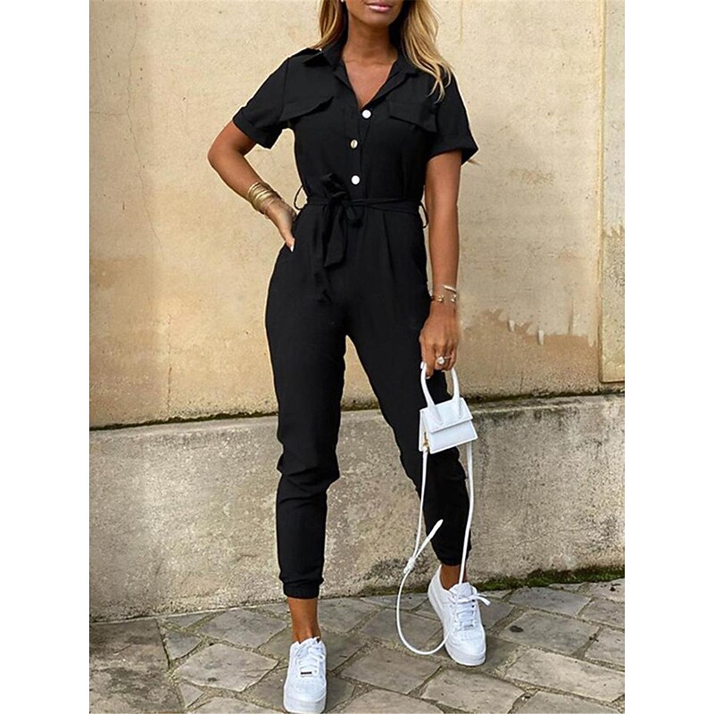 More information about Women's Normal Jumpsuit Streetwear Solid Color Short Sleeve Shirt Collar Pocket Drawstring Street Daily Regular Fit Black White Wine Summer