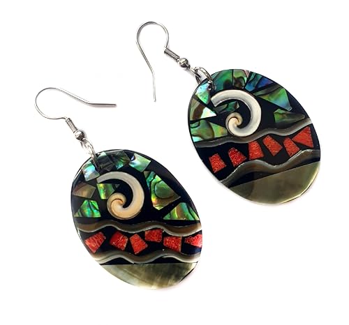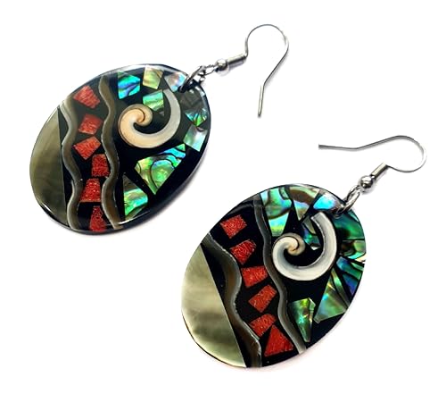 More information about Oval Paua Abalone, Red Coral & Mother of Pearl Earrings, Dangle Drop Seashell Fashion Jewelry DA117