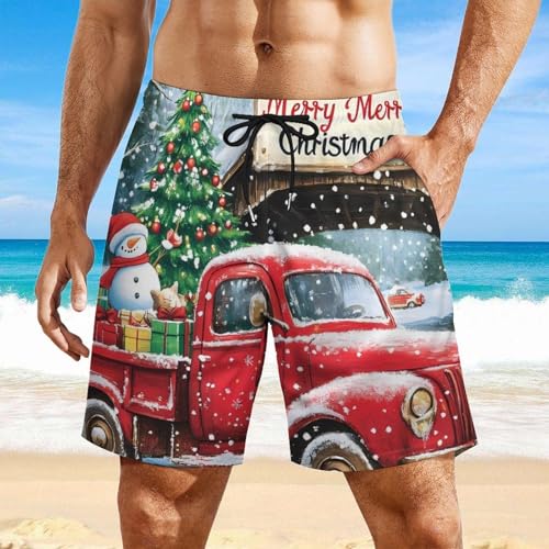 HOT ! Christmas Red Truck Mens Swim Trunks with Quick-Drying Lining Beach Shorts for Outdoor Sports
